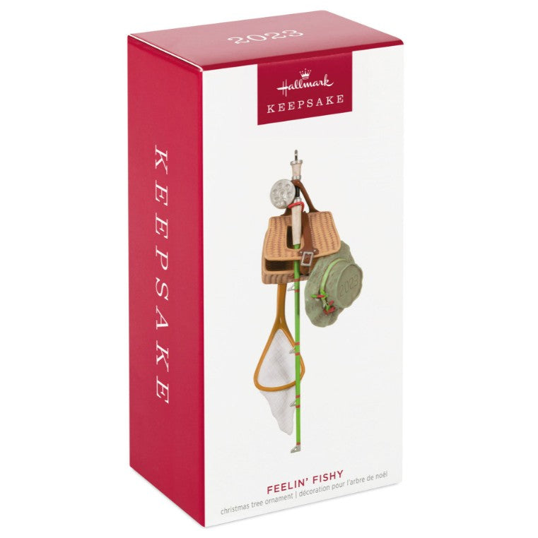 Feelin' Fishy Fishing Gear Ornament. Reel in the fun with rod, reel, creel, net, and lure-covered bucket hat. A merry “fish-mas” for anglers!
