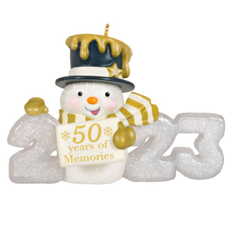 Sweet Decade 50 Years Special Edition Ornament. Glittery snowman forms the “0” in frosty “2023”—KOC exclusive for sweet memory fans!