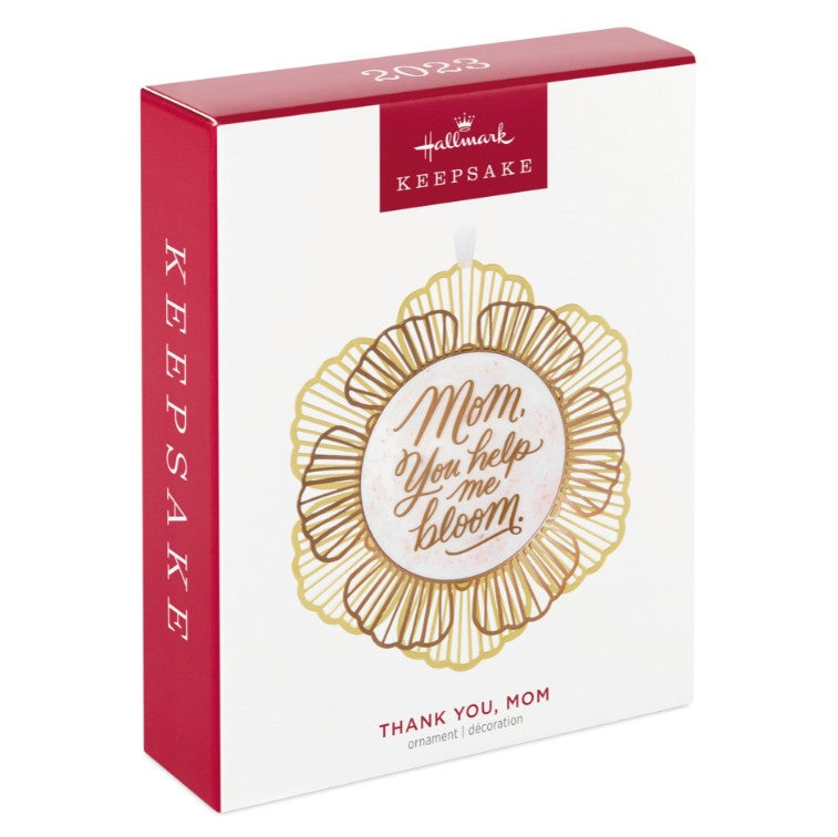 Thank You Mom Floral Metal Ornament. Honor Mom with this blooming metal design: “Mom, you help me bloom”—ideal for Mother’s Day or anytime!