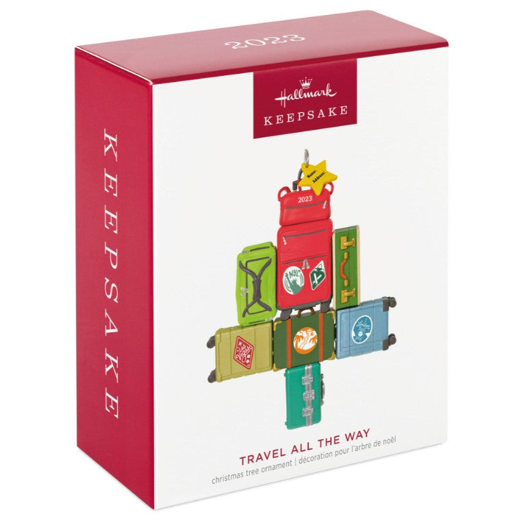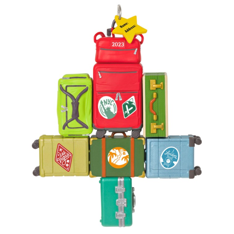 Travel All the Way Suitcase Tree Ornament. Colorful stacked suitcases form a tree with star tag—perfect for wanderlust lovers!