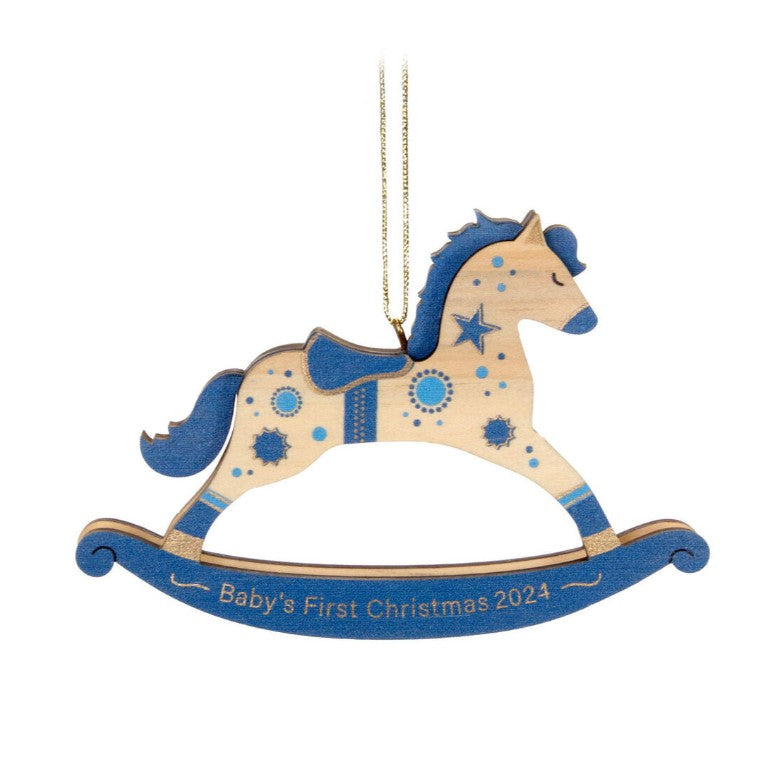 Baby Boy’s 1st Christmas! Rocking horse with blue blanket & wreath, 2024 charm. A cherished milestone Keepsake for new parents & family trees.
