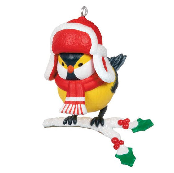 #8 in Cozy Critters Series — a cheerful American Goldfinch bundles up in a red knit hat with ear flaps and matching scarf. Artist-crafted by Nina Aubé, this 2024 Hallmark Keepsake is a feathered hug for birdwatchers, nature enthusiasts, and series collectors — pure winter warmth in miniature.