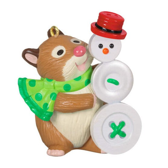 #2 in Cute as a Button Series — a happy hamster crafts a button snowman with a stacked top hat in red & black. Artist-crafted by Nina Aubé & Terri Steiger, this 2024 Hallmark Keepsake is a charming tribute to DIY spirit — perfect for seamstresses, crafters, and button collectors.