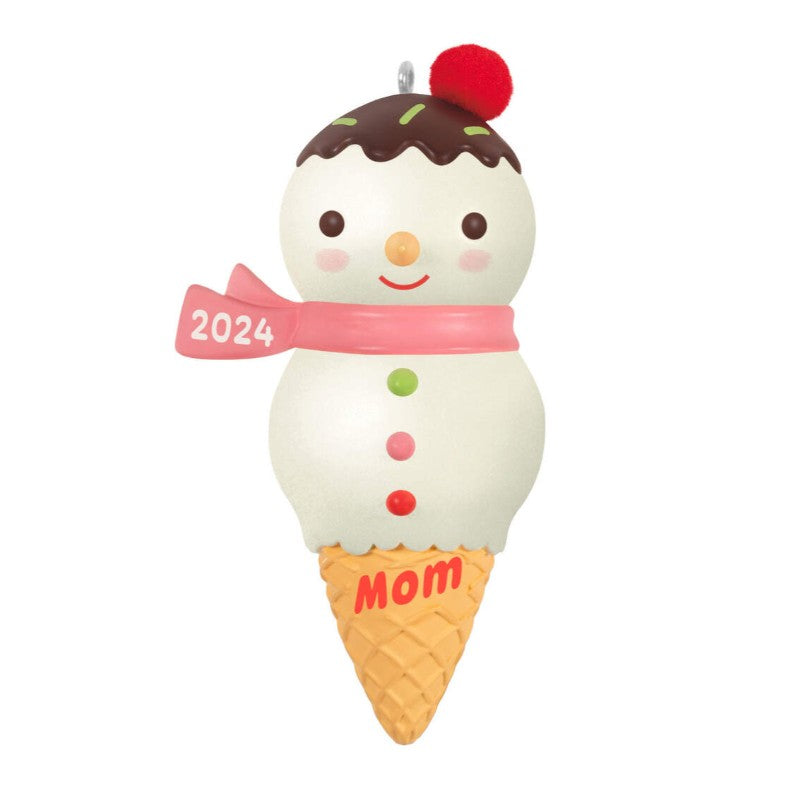 Sweetest mom ever! — This snow lady ice cream cone wears a scarf and hat with "MOM" on the cone. 2024 Hallmark Keepsake—perfect for moms with a sweet tooth.