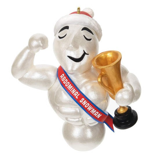 "Abs of snow!" Ripped snowman with six-pack, trophy, “Abdominal Snowman” sash — artist-crafted by Sharon Visker. A 2024 Hallmark Keepsake for gym rats, pun masters, and "do you even lift, bro?" holiday laughs.