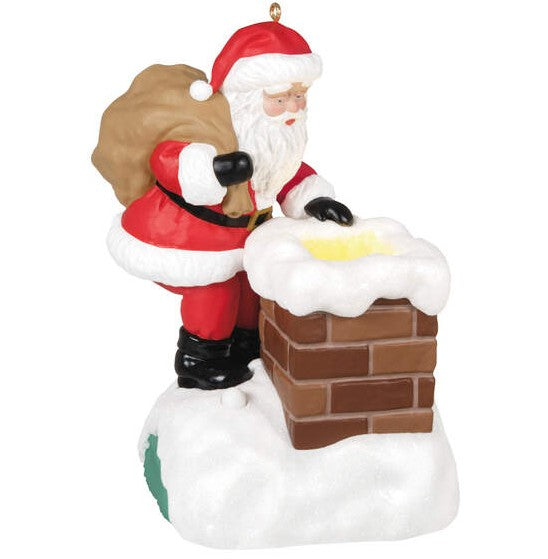 "Up on the housetop, click click click!" Santa descends chimney — glow + voice (battery). A 2024 Hallmark Keepsake for rooftop believers, "he sees you when you’re sleeping", and "down through the chimney" magic.