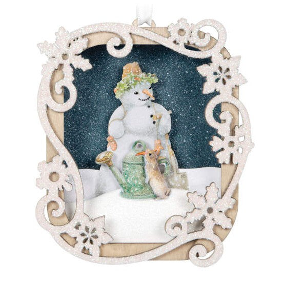 "Winter garden magic!" Laser-cut snowflake frame with papercraft snowman & rabbit at watering can — Marjolein Bastin artistry. A 2024 Nature’s Sketchbook Keepsake for birdwatchers, garden gnomes, and "let it snow" naturalists.